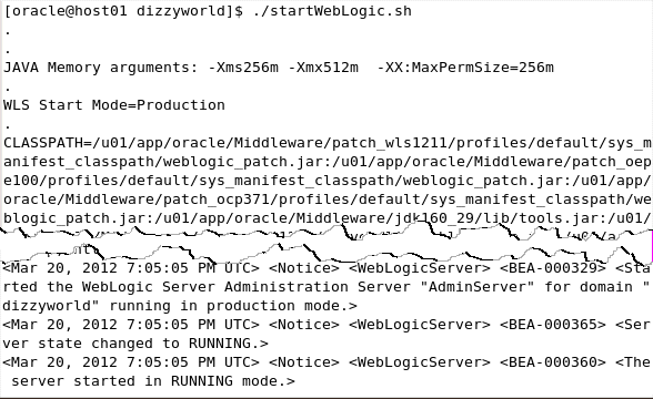 次に、管理サーバーを再起動します。 ターミナル・ウィンドウでドメイン・ディレクトリに移動し、次のコマンドを入力します。 $ ./startWebLogic.sh