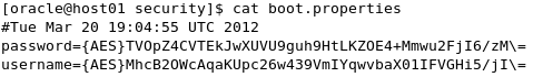 ユーザー名とパスワードがファイル内で安全に保管されていることを確認するには、ターミナル・ウィンドウでsecurityディレクトリに戻り、boot.propertiesファイルの内容を表示します。 $ cat boot.properties