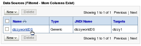 Summary of JDBC Data SourcesページのData Sources表に、新しいデータソース「dizzyworldDS」が表示されます。