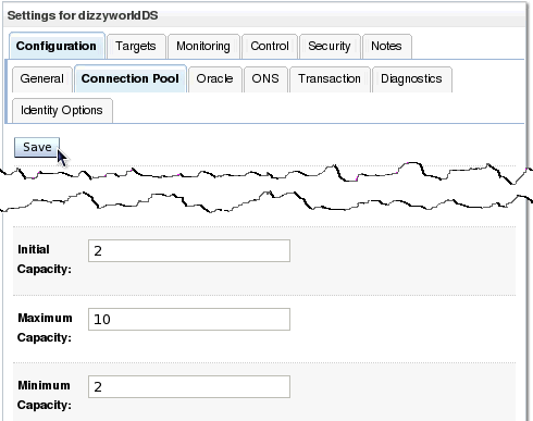 Settings for dizzyworldDSセクションで、Configurationタブ内の「Connection Pool」タブをクリックします。