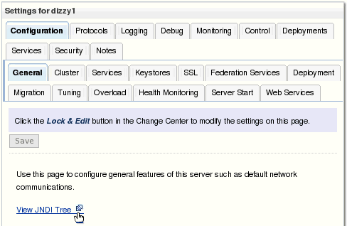 "Settings for dizzy1"セクションで、ConfigurationタブのGeneralサブタブ内で「View JNDI Tree」リンクをクリックします。