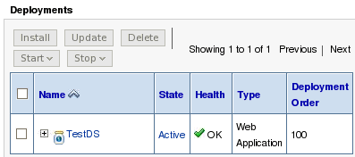 デプロイメントが成功したことを確認するには、管理コンソールのDomain Structureセクションで「Deployments」をクリックします。 次に、Deployments表からState欄が"Active"になっているTestDSを見つけます。