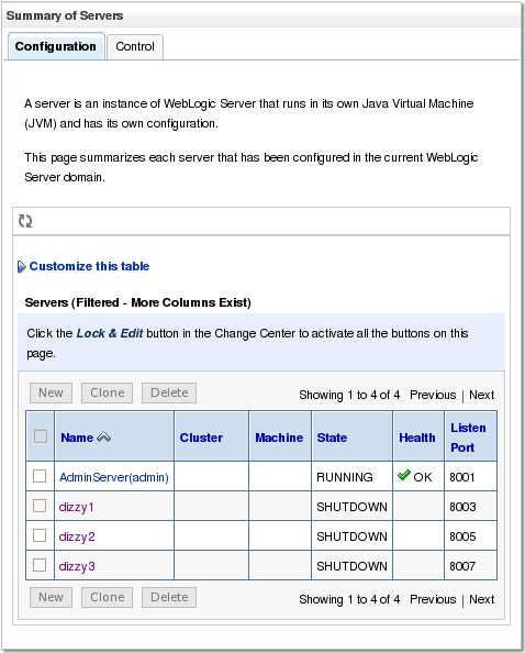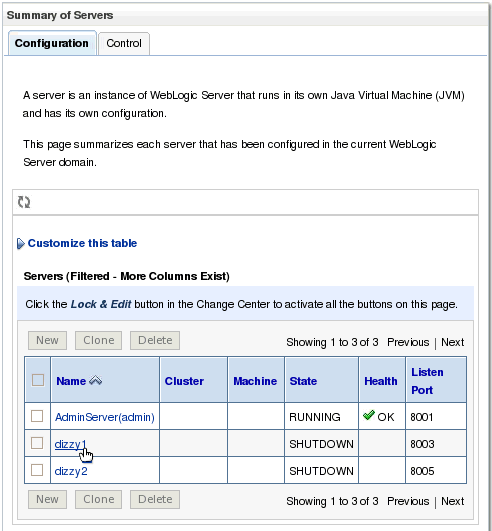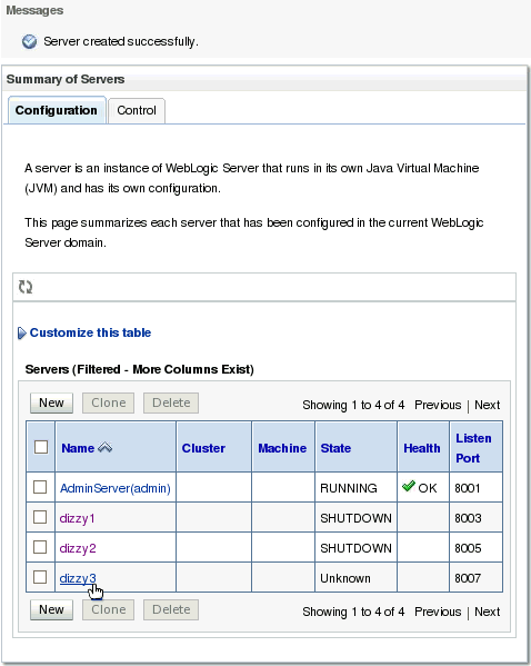 Domain Structureセクションで、再度「Servers」をクリックします。 右側のServers表に、先ほど作成したdizzy3を含むすべてのドメイン内サーバーが表示されています。