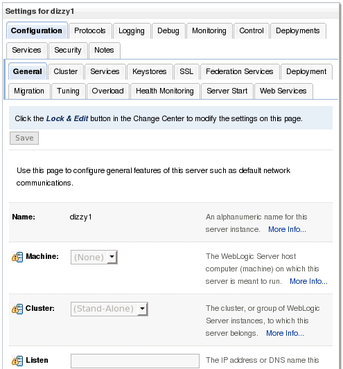 dizzy1の設定または何らかのドメイン構成を変更するには、はじめに構成をロックする必要があります。 管理コンソールの左上のChange Centerで「Lock & Edit」ボタンをクリックします。