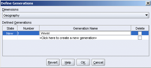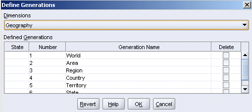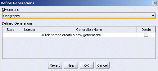 Define Generationsダイアログ・ボックスのDimensionsドロップダウン・リストから、「Geography」を選択します。