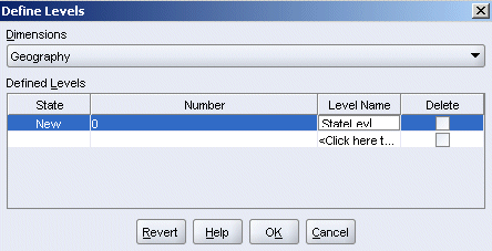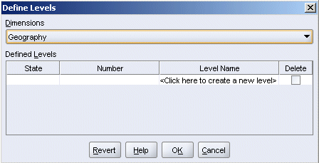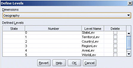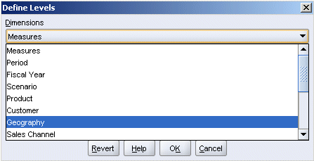 Define Levelsダイアログ・ボックスのDimensionsドロップダウン・リストから、「Geography」を選択します。