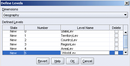 ステップ3および4を繰り返して、追加する販売地域のレベル名TerritoryLev(Level 1)、CountryLev(Level 2)、RegionLev(Level 3)、AreaLev(Level 4)およびWorldLev(Level 5)を入力します。