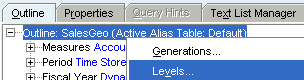 世代名と同様に、アウトラインでレベル名を表示するビジュアル・キューはありません。 ただし、アウトラインの編集セッション中に「Outline」を選択してから「Levels」を選択することにより、レベル名の選択内容を確認できます。これには、下記のようにアウトライン・ノードから右クリックします。