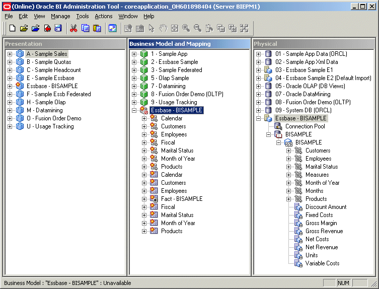 オプション:Physicalレイヤーで、追加したEssbaseデータソースを開いて、BISAMPLEメタデータ・オブジェクトが追加されていることを確認します。