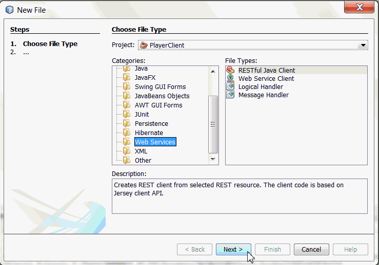 PlayerClientプロジェクトにRESTfulクライアントを作成するには、次の手順を実行します。 a. 「PlayerClient」を右クリックし、「New」→「Other」→「Web Services」→「RESTful Java Client」の順に選択します。 b. 「Next」をクリックします。