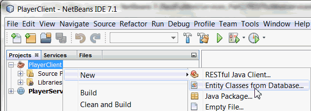 「PlayerClient 」プロジェクトを右クリックして、「New」→「Entity Classes From Database」を選択します。