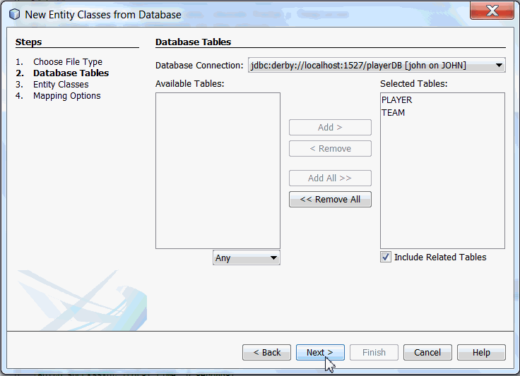 a. Database TablesウィンドウのDatabase Connectionフィールドで、ドロップダウン・リストから「jdbc:derby://localhost:1527/playerDB[john on JOHN]」を選択します。