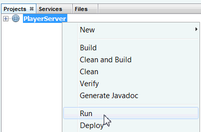 RESTful Webサービスの作成に使用するPlayerServerアプリケーションが実行中であることを確認します。 実行中でない場合はサーバーを起動し、次の手順を実行します。 a. 「Projects」タブを開きます。 b. 「PlayerServer」プロジェクトを右クリックします。 c. 「Run」を選択します。 これによってGlassFishサーバーが起動され、アプリケーションがデプロイされます。