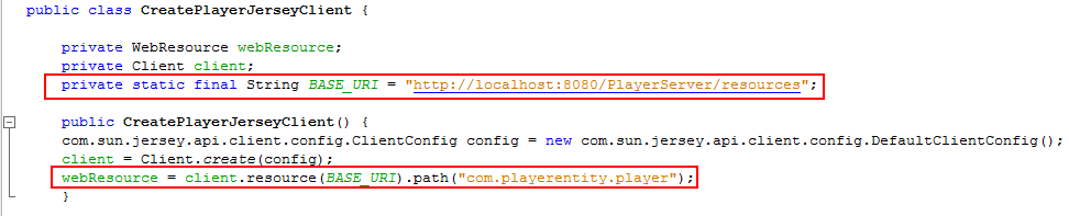 CreatePlayerJerseyClient.javaを確認します。 a. URIとRESTfulサービスのパスを使用してWebResourceが初期化されているコードの断片を探します。