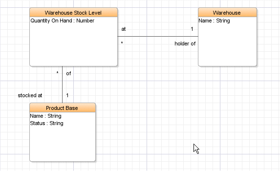 このクラス・モデルを更新して、新しいクラスをデータベース表へと変換します。 既存のクラス・モデルから明らかであるとおり、WarehouseStock Level(倉庫在庫水準)クラスには各Warehouse(倉庫)に保管されているProduct(製品)のQuantity on Hand(数量)が記録されます。