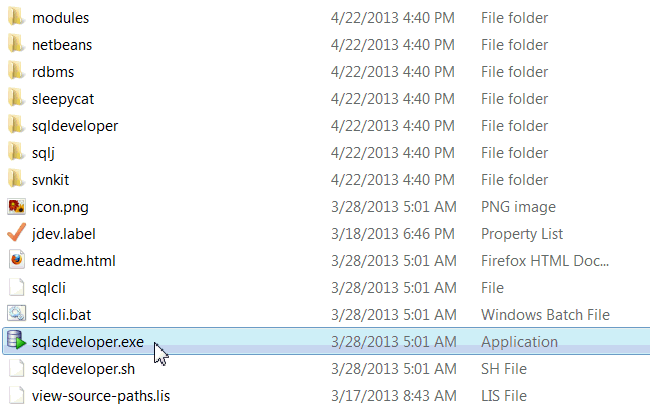 SQL Developerを起動するために、下の図のようにSQL Developerをunzipしたディレクトリにあるsqldeveloper.exeをダブルクリックします。このファイルに対して、デスクトップにショートカットを作成することも可能です。