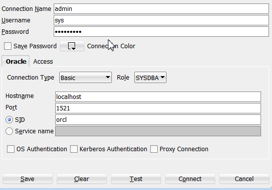 接続の設定例: ローカルにデータベースをインストールし、コンテナ・データベースを利用しない場合(SIDを使用)