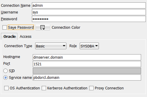 注記: Oracle Database 12c release 1では、プラガブル・データベースをインストールするオプションがデフォルトで有効となっています。インストール時にこのオプションを選択した場合には、接続のSIDではなく、サービス名としてプラガブル・データベース名を指定する必要があります。
