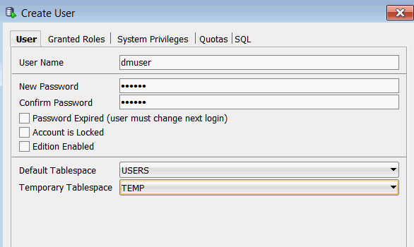 C. ユーザーの作成ウィンドウで、ユーザータブを選択し、作成するユーザーのユーザー名、パスワード、デフォルト表領域、一時表領域を指定します。