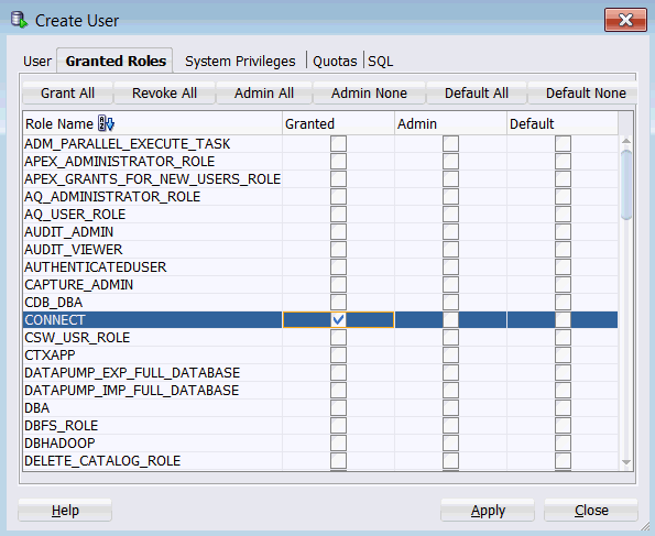 D. ユーザーの作成ウィンドウの付与されたロールタブを選択し、CONNECTの付与済のチェックボックスをクリックします。