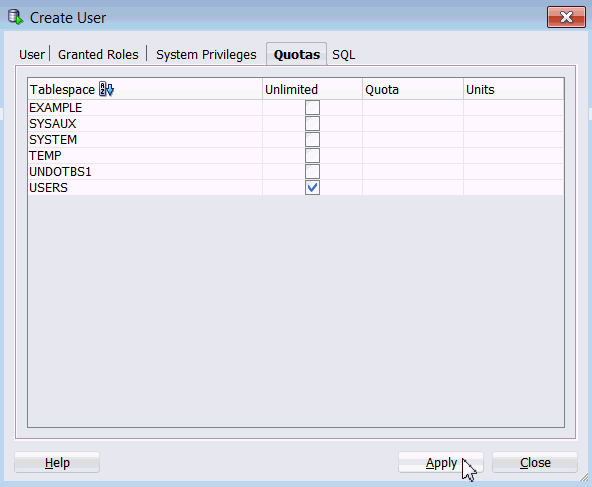 E. ユーザーの作成ウィンドウの割当て容量タブを選択し、デフォルトのUSERS表領域の無制限のチェックボックスをクリックします。