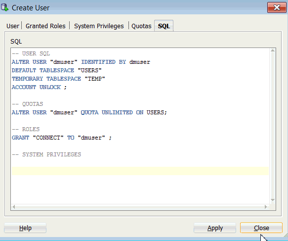 次に、データマイニング・ユーザー用のデータベース・アカウントを作成します。