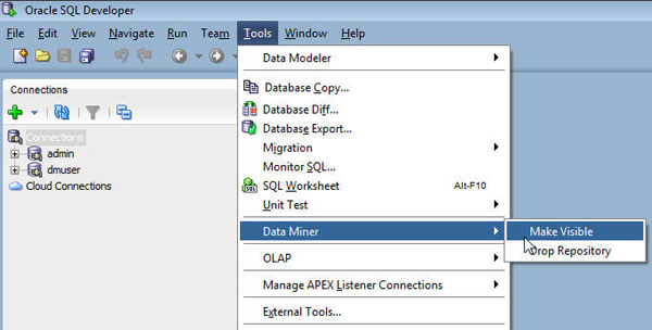 SQL Developerメニューからツール > Data Miner > 表示を以下のように選択します: