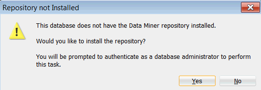 結果: A message tells you that the Data Miner Repository が、データベースにインストールされていないことを示すメッセージが表示され、レポジトリのインストールを開始するかどうかを問われます。