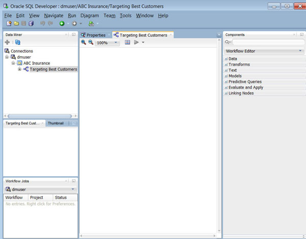 開始するには、SQL Developerインタフェースのエレメンツ([接続]タブや[レポート]タブなどが含まれる)をすべて閉じ、以下のように、Data Minerタブのみを開きます: