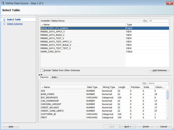 B. データ・ソースの定義ウィザードで、NSUR_CUST_LTV_SAMPLE 表を選択し終了をクリックします