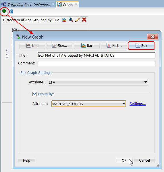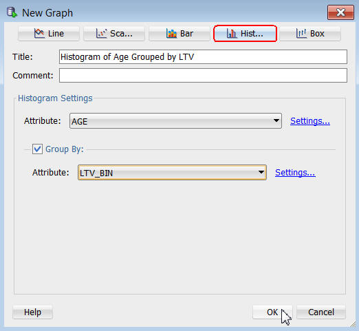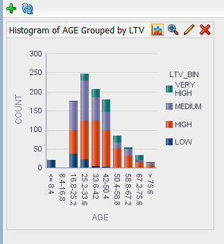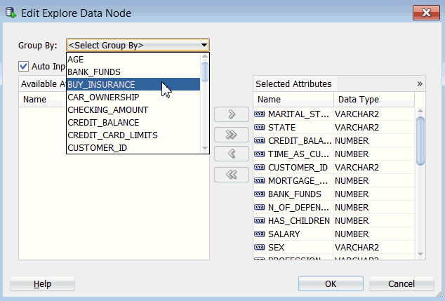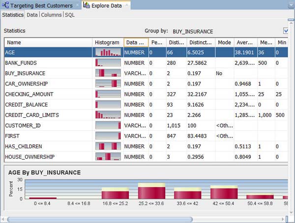 - Data Minerは、定義したデータセット内の各属性に関するさまざまな統計を、「グループ化基準」属性に定義した属性(BUY_INSURANCE)について算出します。次の列が出力されます:ヒストグラムのサムネイル、データ型、個別値、個別値パーセント、モード値、平均値、中間値、最小値、最大値、標準偏差、分散