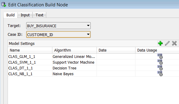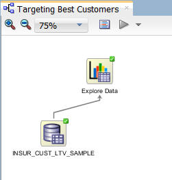 - Oracle Data Minerによって、 ワークスペースノード名とモデル名は自動で作成されます。この例では、「データソース」という名前が生成されました。 このレッスンで示したものと全く同じノード、モデル名を取得できない場合があります