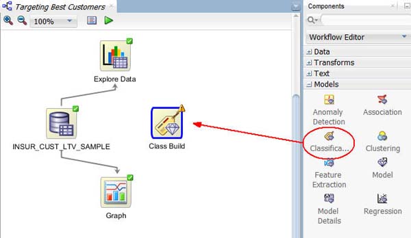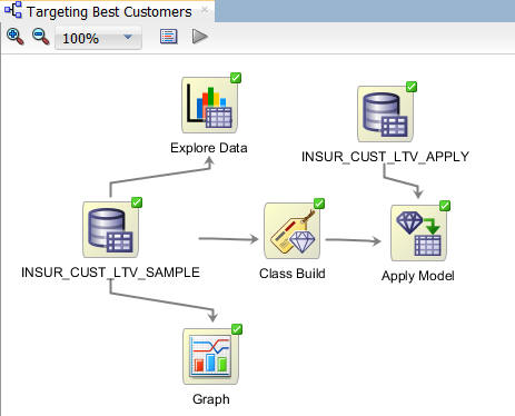Oracle Data Minerでは、ワークフローの作成プロセスは、モデルの構築およびテスト中の困難なタスクの多くを自動化します。これは、ビジネス上の課題を解決するのに最も良いアルゴリズムがなんであるかを事前にすることはとても困難なので、通常、いくつかのモデルを作成しテストします。完全なモデルというものは存在せず、最良な予測モデルを検索するということは、必然的に最も制度の高いモデルを決定するということではなく、ビジネス上の目標という観点から許容されるエラーの種類を決定するということになります