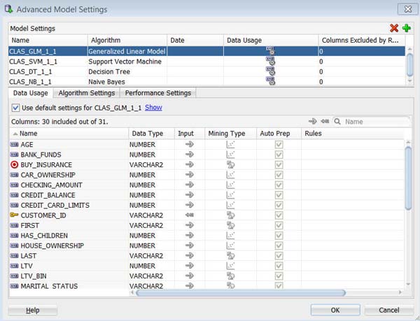 まず、モデルのターゲット値の詳細を表示するためにをGLMモデルを選択します。各モデルの「ターゲット値」はBUY_INSURANCE属性であることを思い出してください