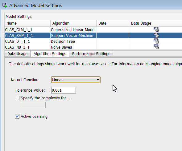 - 詳細モデル設定ウィンドウでは、4つの分類アルゴリズムのそれぞれについて、データの使用方法、アルゴリズム設定、パフォーマンス設定について変更できます