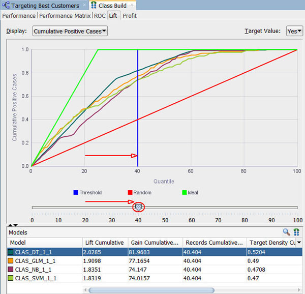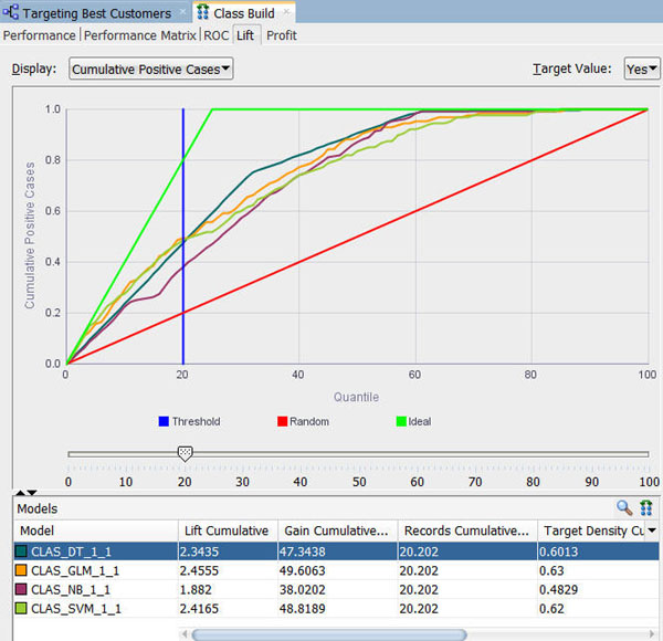 上記の例では、20分位でDT、一般化線形モデル(GLM)、およびSupport Vector Machine (SVM)のモデルは、累積リフトと累積利益%の値はとても近いものを示しています
