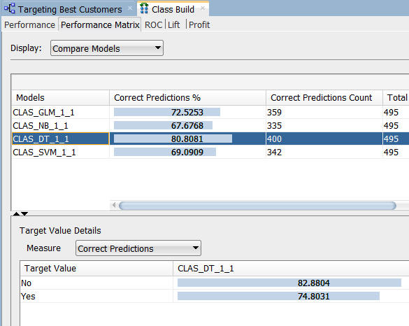 注: パフォーマンス・マトリックスでは、DTモデルの正しい予測%の値がほぼ81%に達していて、最も高い値をだしています。次点のGLMは72.5%です