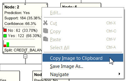 ワークフローペインに戻り、再び分類構築ノードを右クリックし、モデルの表示> CLAS_DT_1_1 を選択します。(注: ディシジョンツリー・モデルの名前が異なることがあります)