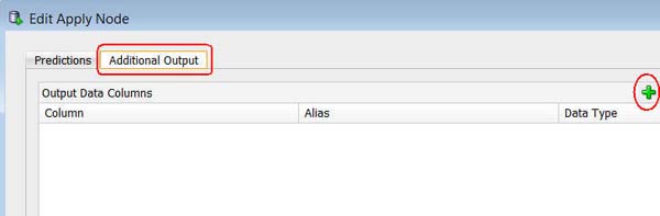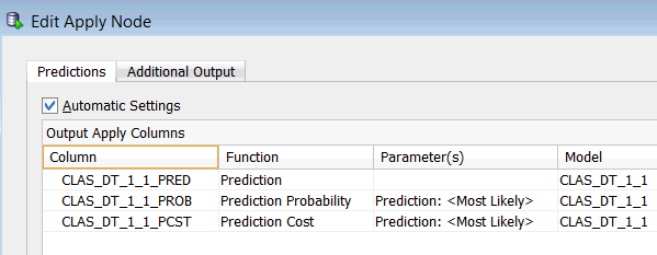 結果: 適用ノードの編集ウィンドウが表示されます。予測、予測確率および予測コストの列が予測タブに自動的に追加定義されています。