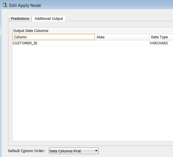 適用するモデルノードを実行する前に、結果のアウトプットについて検討します。デフォルトでは、各顧客のための情報のための2つの列を作詞します:
