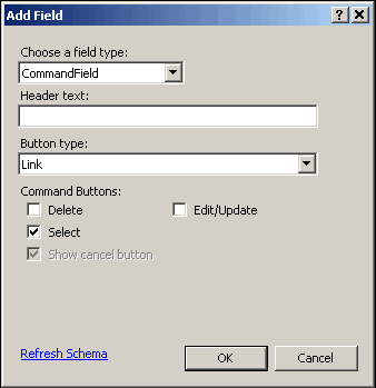 | 3. | Select列をGridViewに追加します。 前と同様に、GridViewタスクからAdd New Columnを選択します。 ダイアログで、「CommandField」フィールド・タイプを選択し、コマンド・ボタンのタイプで「Select」をクリックして、Buttonタイプは自動的に選択されるLinkにします。 「OK」をクリックします。