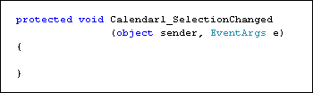 Visual StudioがカレンダーのSelectionChangedイベントを構成し、このイベントを処理するメソッドのメソッド・スタブを追加します。 このメソッド・スタブは、必要なコードを追加できるようにコード・エディタに表示されます。