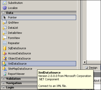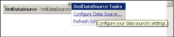 | 4. | XmlDataSourceの上の小さな矢印をクリックし、ConfigureDataSourceを選択します。