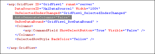 ソース・ページに進み、 コード行は、以下のようになります。 <asp:CommandField ShowSelectButton="True" Visible="False"/> (この行を削除することもできます。その場合は、必ずGridView列を参照する