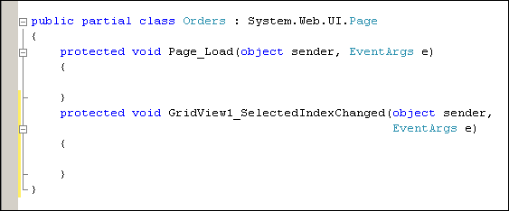 コード・ビハインド・ページ(Orders.aspx.cs)に進み、以下のメソッドとコードを追加します。 protected override void Render