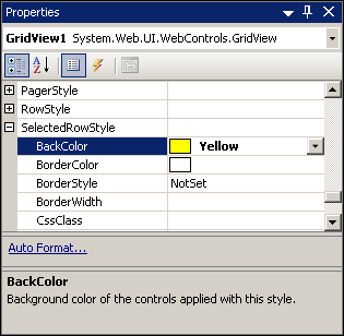 | 9. | そこで、GridViewのプロパティに少し変更を加えます。 選択した行の背景色を黄色に設定します。