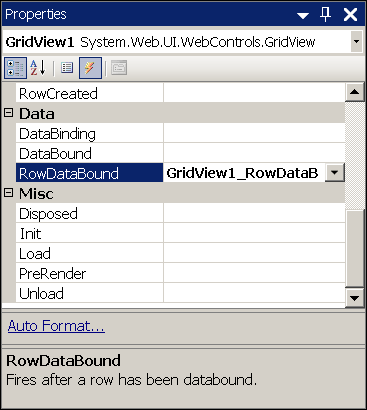 プロパティ・パネルの「Event」アイコンをクリックし、「RowDataBound」をダブルクリックします。 このイベントのデフォルト名を持つメソッドが作成され、コード・エディタが表示されます。