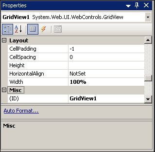 | 3. | 設計エディタでGridViewを選択し(エディタのGridViewの外側に点線が表示されます)、プロパティ・パネルでWidthを100%に設定します。