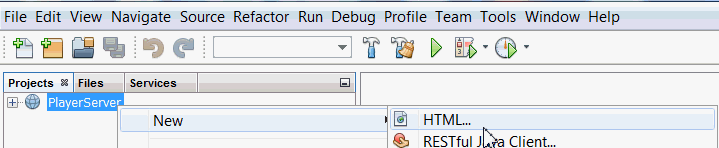 HTMLファイルを作成するには、「PlayerServer」プロジェクトを右クリックし、「File」→「New」→「HTML...」を選択します。