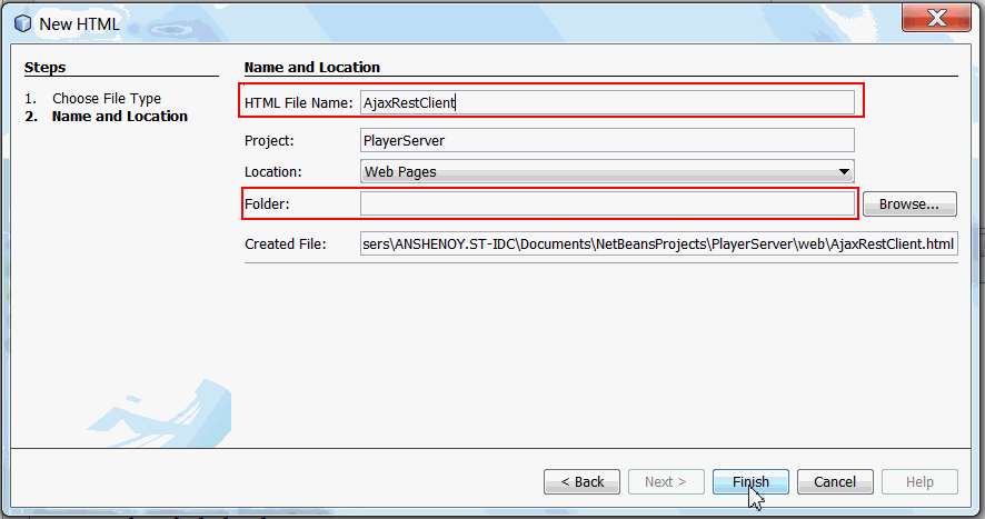 以下の手順を実行します。 a. 以下の詳細情報を入力します。 File Name:AjaxRestClient Folder:フォルダ名を入力する必要はありません。 HTMLファイルはデフォルトでWeb Pagesフォルダの下に作成されます。